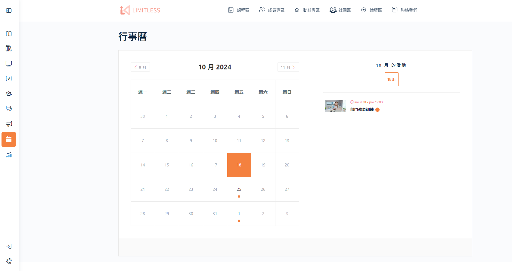 ※本平台行事曆不提供一般用戶新增,只提供管理人員後台新增訊息※當管理人員新增完行事曆,動態專區將會顯示提醒平台的行事曆顯示在左邊側邊欄