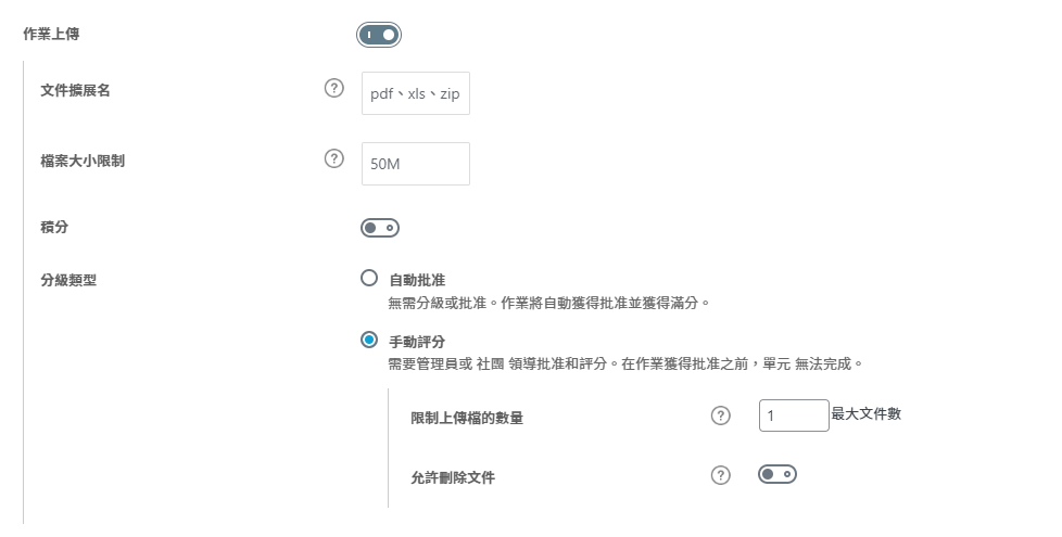 手動評分:當上傳完作業時需要等待平台的「管理人員」進入後台/講師儀表板,進行批改作業,經過完成批改才能完成該課程