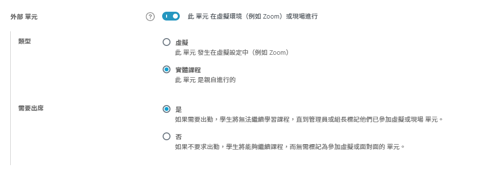 是:當設定為「是」時,學生無法繼續下一課程步驟(適用於線性課程進度),除非管理員或小組負責人標記他們已參加虛擬或實體課程,課程頁面上將不提供「標記完成」按鈕,管理員或小組負責人「必須」從後端的使用者個人資料頁面將課程標記為完成