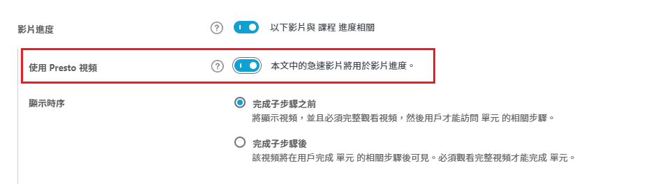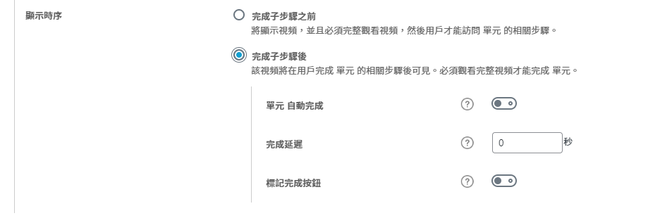 單元自動完成:當影片看完時,需等待1-2秒等待系統判定,才會自動跳完成(不建議開啟,除了不直觀外,當使用者不清楚直接關掉,但系統還在判定中時,會造成系統錯誤,把用戶判定為未完成)