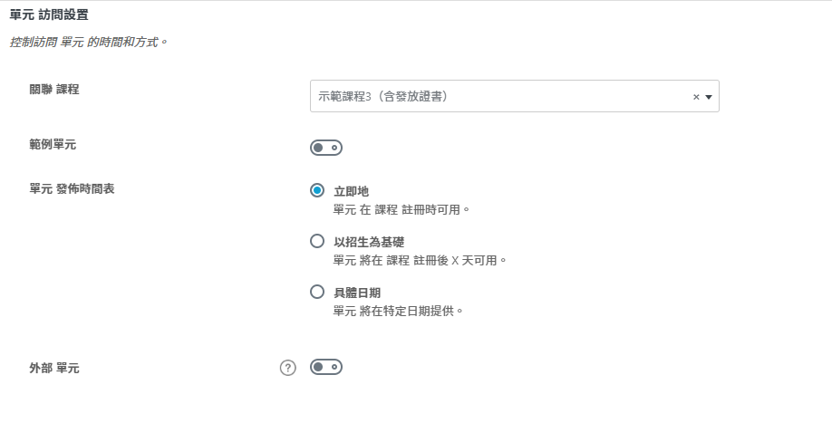 關聯課程:將該課程內容分配在哪一個課程之下(通常會從課程中進行新增,所以這部分不須設置)