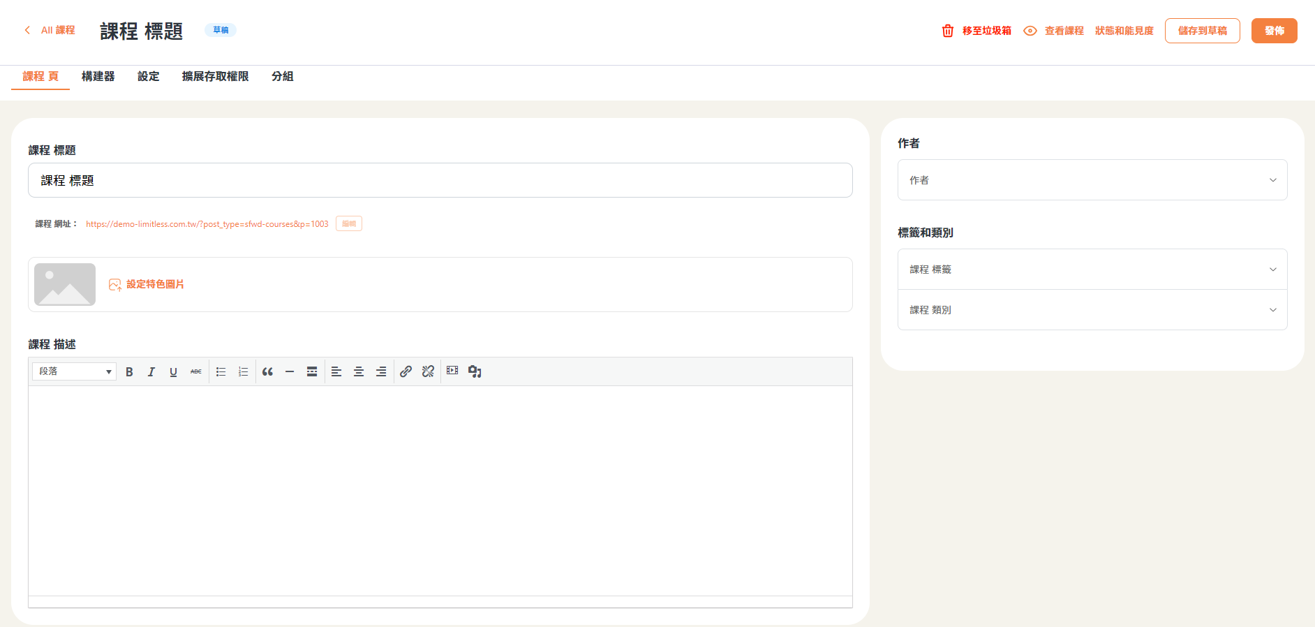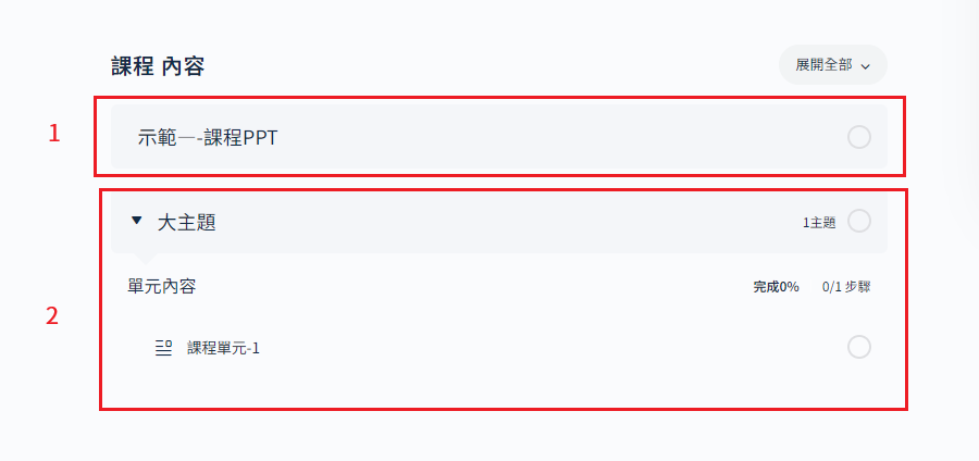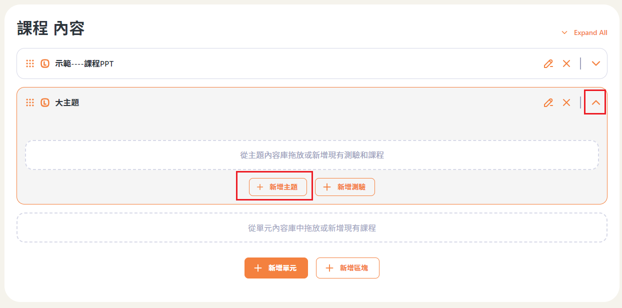 當您需要一個大主題,主題底下則需要相關課程,只需要點擊「新增單元」→ 編輯內容(只需要新增標題,其他無需做任何編輯) → 直接發佈