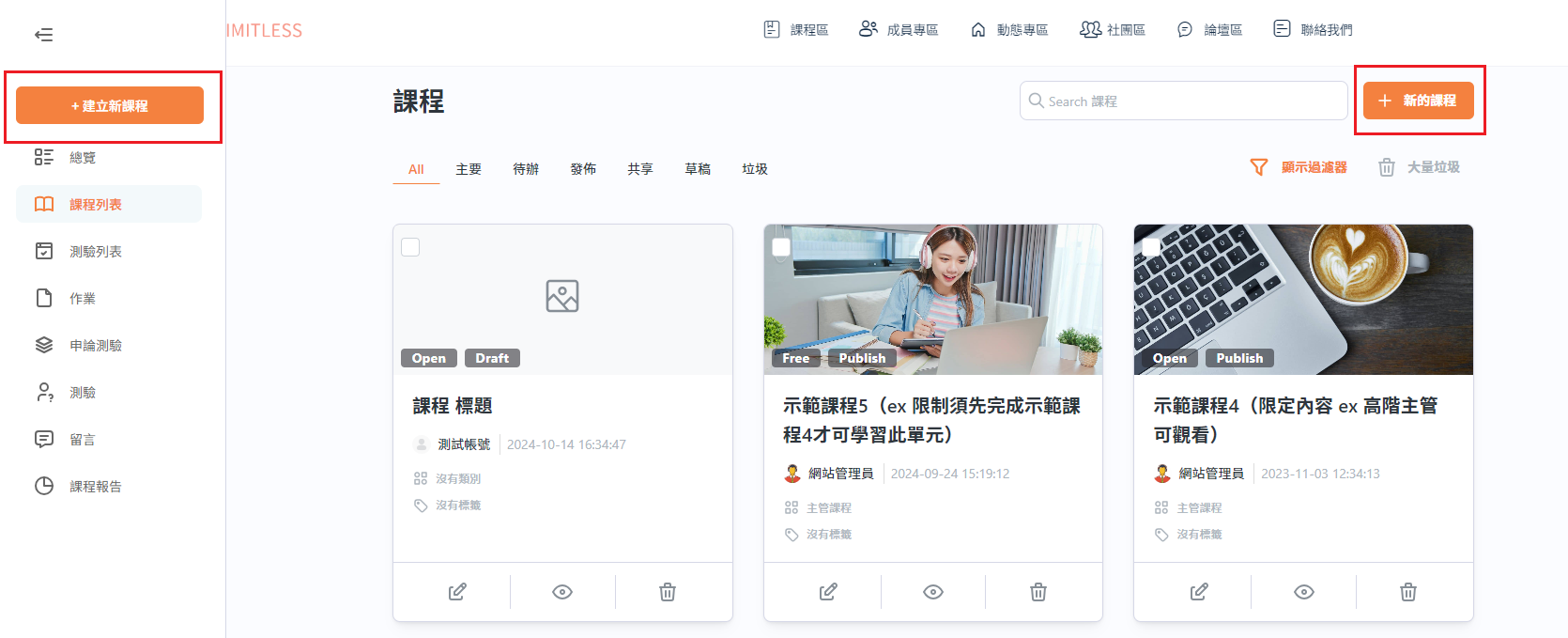 您可以從左邊側邊欄或者右上角的「新課程」按鈕,創建一個新的課程