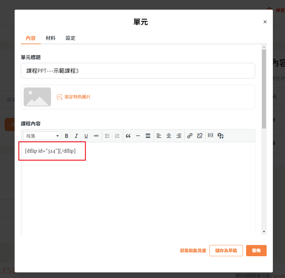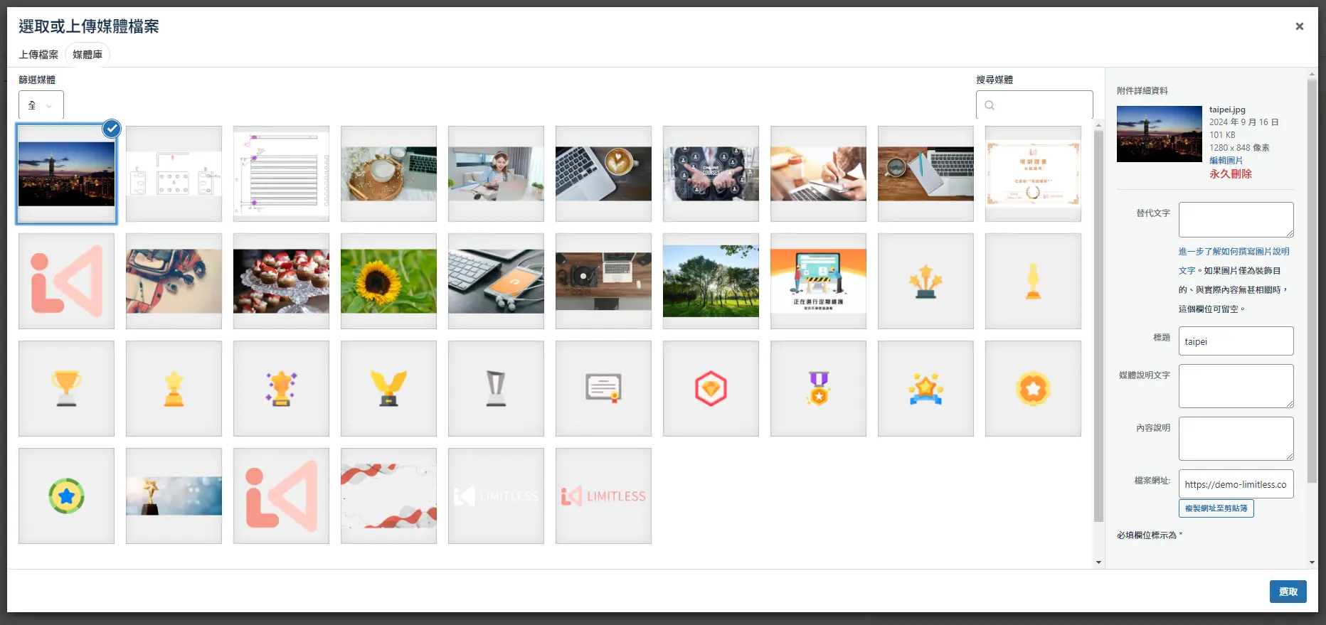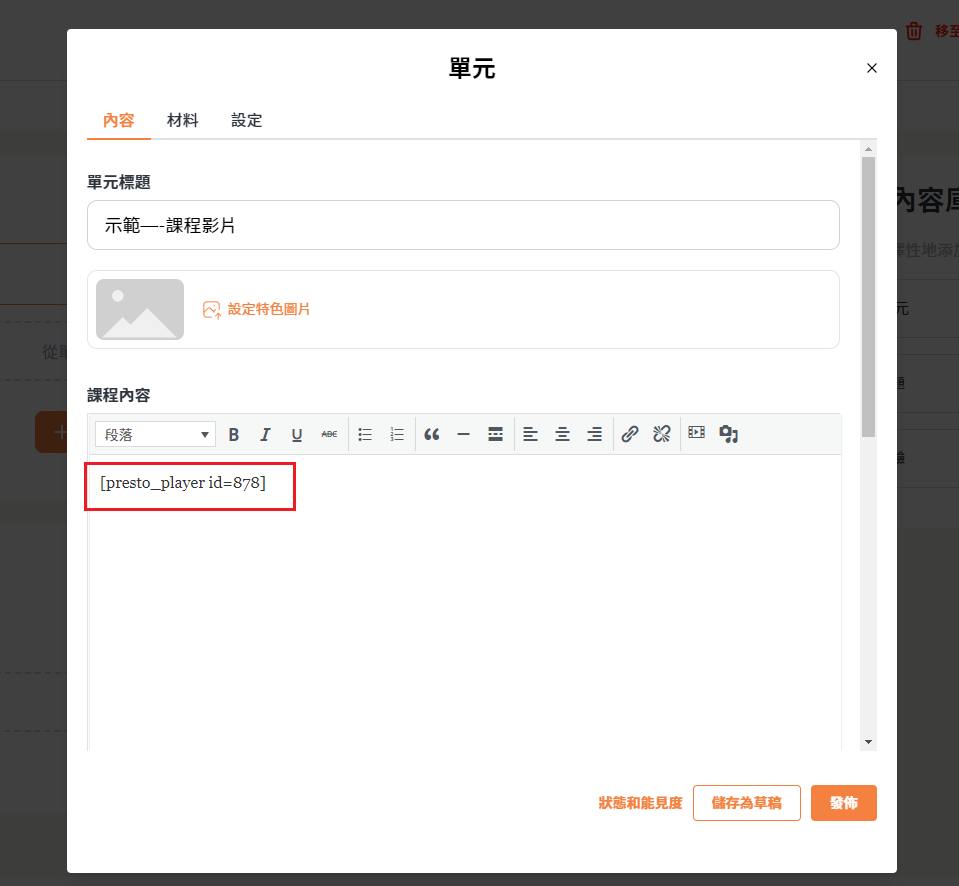 點擊設定特色圖片後,就可以上傳或者選取媒體庫原有的照片當作課程圖片