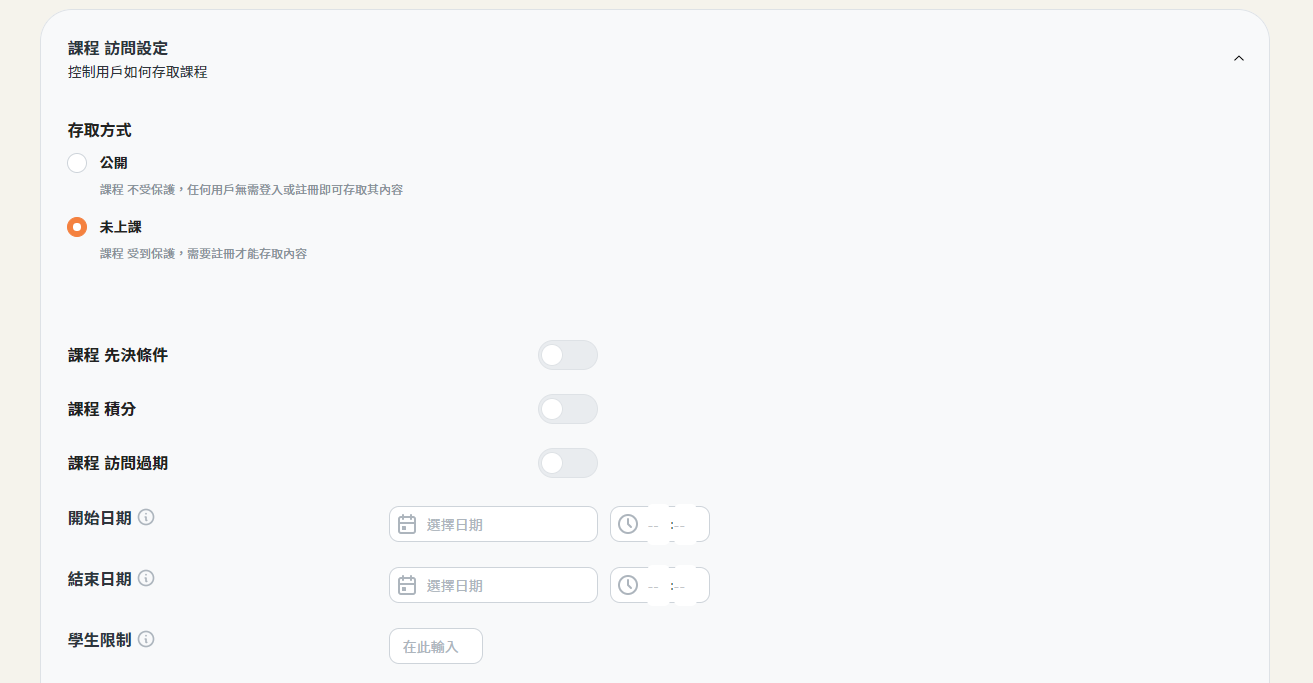 開始與結束時間,並且可限制學生人數(當有設置此功能,需要延期可以設定擴展存取權限)