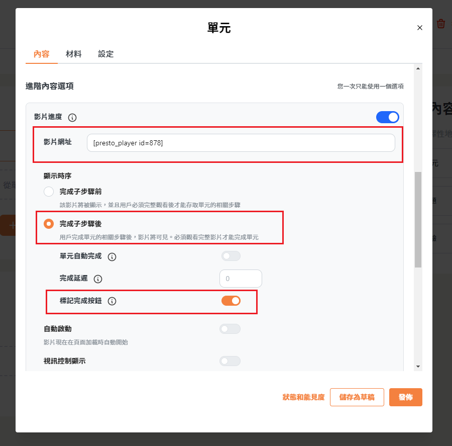 單元自動完成:當影片看完時,需等待1-2秒等待系統判定,才會自動跳完成(不建議,不直觀外當使用者不清楚直接關掉,但系統還在判定中時,會造成系統錯誤,把用戶判定為沒完成)